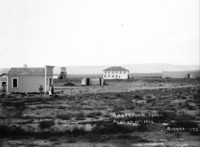 PC-2257 "Hollister in 1912;" wide view of early Hollister across a sage brush plain, showing several buildings.