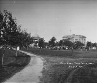 PC-2256 "City Park, Twin Falls, Idaho;" many people gathered near the band stand (gazebo); County Court House in the background.