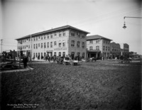 814 "Before the Paving, 1910; wagons and teams of horses in muddy intersection in front of the Perrine Hotel at the corner of Main Street and Shoshone Street; people stand on sidewalks and street; also visible: Abstracts, Fire Insurance; Rexall Drug Store; McDonald's Chocolates; Shoe Store; Grocery