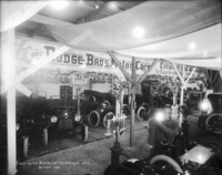 786 "First Auto Show in Twin Falls, 1916;" showroom, with several new automobiles displayed. Signs read: "Dodge Brother's Motor Cars;" "Exhibit of Lind Automobile Company: The Oldest Automobile Firm in Southern Idaho;" a few men stand near cars