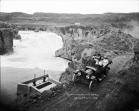 793 "Enjoying Life in a Buick;" People in an automobile, looking down at Shoshone Falls from the north side, with the Shoshone Falls Hotel and other outbuildings across the river.