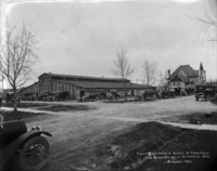 784 "First Tabernacle Built in Twin Falls for Evangelistic Services, 1916;" low, wooden building surrounded by automobiles on the corner of 4th Ave E and 2nd St E (Hansen St E); Methodist Church on right