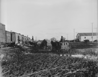 795 "Twin Falls, The Potato Belt;" two wagonloads of bagged potatoes being loaded on railroad freight cars. Other men, wagons, and teams of horses visible