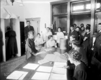 791 "Election Day, Twin Falls High School;" interior view of room in building; students in line to sign in and receive ballots; voting booth on left; safe on back wall