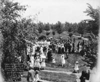 798 "Cornerstone Laying Methodist-Episcopal Church, Twin Falls, Idaho;" crowd of people gathered to celebrate addition to church (original church building in background)
