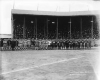 783 "Twin Falls, Idaho. November 9, 1915;" Baseball teams, Nationals and Americans, stand on field at Twin Falls Athletic Field, with large audience in the stands