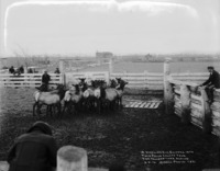 782 "19 Yearling Elk Shipped Into Twin Falls County from the Yellowstone region; March 5, 1916;" Men standing in and around pen; Hansen school in background