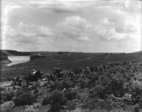 770 "They Are Buicks;" line of automobiles on a dirt road; Salmon Dam and buildings visible in the background.