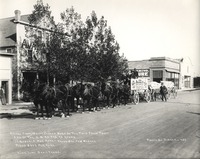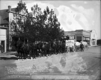 780 B "Record Crop White Clover Seed of the Twin Falls Tract and of the U.S. as Far as Known. 17 Bushels Per Acre - Value $21 Per Bushel. Yield $357 Per Acre. High Line Seed Farms;" three wagon loads of white clover seed in front of the Avant House on 2nd Ave E, pulled by four teams of horses. Sign on one wagon also states "275 1/2 Bushels; Clover, Idaho; from 16 1/5 Acres of Land;" Lavering Furniture and Lavering Theater on right