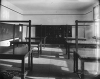 656 "Physics Room; Twin Falls High School;" empty classroom, with worktables; display case at front of room.