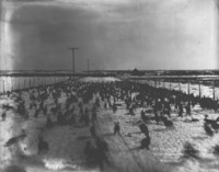 665 "3067 Rabbits Were Killed in the Morning Drive. February 11, 1913;" Rabbit drive, with hundreds of rabbits in the foreground being pushed down a lane by a large group of hunters in the background