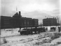 664 "December 21, 1912. The First Freight Car. Twin Falls Electric Railway;" railroad car on 2nd St N (now Gooding St N); County Court House and High School in background.