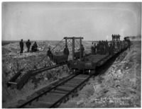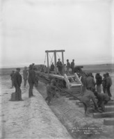 634 "Laying the Oregon Short Line, Buhl Extension. 1906;" men laying railroad track, using large machines.