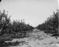 624 "Five Year Old Trees Showing Copper Circuit Thermometer Line, Murtaugh's Pioneer Orchard;" orchard with electric power lines overhead.