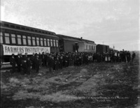 632 "The First School of Agriculture in Twin Falls, 1910; group of people, and a couple of cows, standing alongside a train. A sign on the train says, "Farmers' Institute Special."