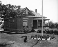 626 "Residence of M.M. Murtaugh, Blue Lakes Boulevard, Twin Falls, Idaho;" brick house and front lawn; dog and flagpole also seen