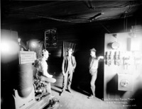 629 "1st Electric Power Plant. Twin Falls, Idaho;" Three men standing beside electrical equipment in the Hotel Perrine.