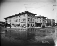 573 "Hotel Perrine. Twin Falls, Idaho;" corner view of the hotel on Main Avenue and Shoshone Street; people on sidewalks and cars and horse-drawn vehicles in street. Also visible: Bert Sowle; Perrine Hotel Cigar Store; Abstracts, Farm and City Loans; Rexall Drug Store (Skeels-Wiley Drug); Grocery; 5 and 10 Store. Large sign on corner states: Carnation Club Dance at Dreamland Hall. Every Tuesday and Friday Evening, Friedman's Piece Orchestra. Everybody Welcome