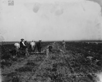 571 "H.B. Johnson Orchard in 1906;" Horse-powered potato digging machine at work. Two men and a boy operating a four-horse team.