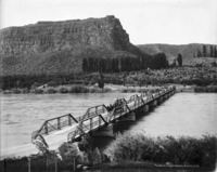 523 "The Blue Lakes Bridge;" stagecoach crossing bridge; Perrine Ranch in the background, with poplar trees growing along the bank of the river