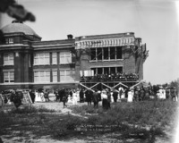 529 "Laying Corner Stone. July 4th 1912. Addition to the High School Building;" crowd of people listening to speaker on scaffolding of new wing addition to Twin Falls High School.