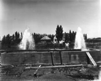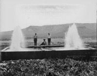 518 "Wells at Artesian City, Idaho;" Three men standing behind artesian wells.