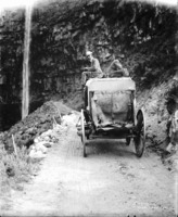 524 "Overland;" View of the back of a stagecoach stopped on the way up a grade in the canyon; Perrine Coulee Falls in background; two men on the coach.