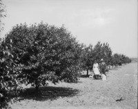 527 "Cherry Trees. Fourth year. P.C. Davis. Twin Falls, Idaho;" man and a woman standing with dogs in an orchard.