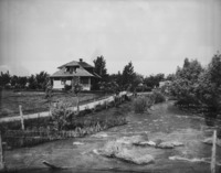 513 "The Alex McPherson Home Near Twin Falls, Idaho;" An irrigation coulee running alongside house. Trees and outbuildings also visible.