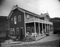477 "Shoshone Falls Hotel;" people gathered on the front parch; bicycles resting against side of the building