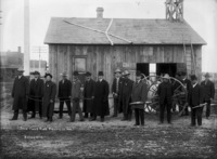 472 "Twin Falls Fire Fighters, 1906;" fifteen men posing with a hand-operated pump beside a wood frame building
