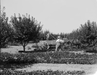 479 "Spraying Murtaugh Pioneer Orchard, August 1911;" Three men with a team of horses, working in the orchard.