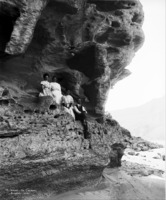 473 "In Idaho--Of Course; Three women and a man seated below overhanging rocks in the canyon