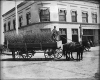 478 "Conway Orchard, 1908;" wagonload of young trees in front of the First National Bank building on the corner of Main Avenue and Shoshone Street; also visible: Twin Falls Title Company; Twin Falls Hardware Company;