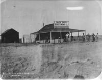 390 "First Building in Twin Falls -1905;" Twin Falls Investment Company; Robert "Bob" McCollum in white shirt on porch, Alice McCollum seated in chair on porch; surveyors, including John Hayes to the right (This photo is a reproduction of one taken by Elva McCollum.)