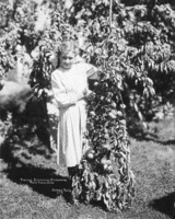 381 "Peaches Grown by Dr. Stearns; 1 mile north of Twin Falls, Idaho;" little girl standing beside fruit tree.