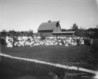 382 "Old Settler's Picnic - August 16, 1911. J.A. Waters Grove;" large group of people in a clearing before a barn.