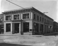 339 Twin Falls Bank and Trust Company Building; corner of Main Avenue and Shoshone Street; Also visible: George Herriott, Attorney at Law; Roberts Daly Company, Orchard Lands; Mark M. Murtaugh Consulting, Hydraulic and Construction Engineer; Straus Glauber Clothing (building next door on Shoshone); Dr. McAtee, Dentist (building next door on Main)