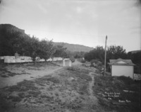 210 "Main Street, Hollister, Idaho. October 2nd, 1909;" Several men standing along a dirt street, buildings and phone lines in the background.