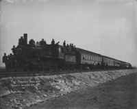 209 "First Passenger Train into Hollister, Idaho, October 2nd, 1909;" train with an engine and six passenger cars sitting on the railroad tracks; people in front of and on top of the train and on the tracks.