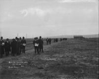 207 "The Return from the Field. Twin Falls Tract;" Several men and teams of horses standing near a barn.
