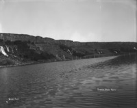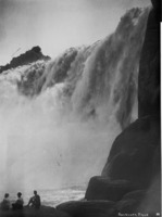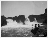 88 "Shoshone Falls;" view from the base of the falls, with three men seated along the river.