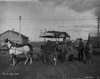 091 "Twin Falls County Game;" four men with guns and a wagon-load of deer, standing in a roadway.