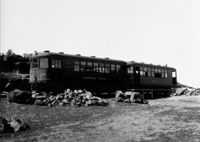 PC-2343 Twin Falls Electric Railway cars sitting at the platform at Shoshone Falls. Large rocks in front of railroad tracks