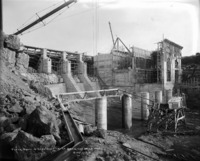 A 003 "American Falls Power Plants;" construction of the dam and one of the power plant buildings. Several town buildings in background.
