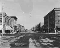2121 Wide view of the early town, taken from the Courthouse looking south at Shoshone Street. The Perrine Hotel, Twin Falls Bank and Trust, First National Bank, and Rogerson Hotel buildings can be seen. In the distance are the grain elevators.