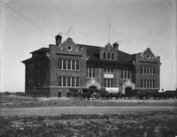 154 Wagon teams waiting to transport students at Lincoln School, soon after its construction. (This building was demolished in 1975.)