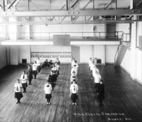 PC-2307 "High School Gymnasium;" Twin Falls High School students in formation on the gymnasium floor, a couple sit on the floor in the back; staircase and mezzanine can be seen; basketball hoop and weights also visible