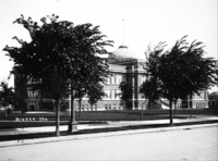 PC-2312 Looking north at Twin Falls High School; trees line the Shoshone St sidewalk.