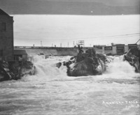 PC-2301 "American Falls;" river-level view of the dam, channel and control house below the dam.